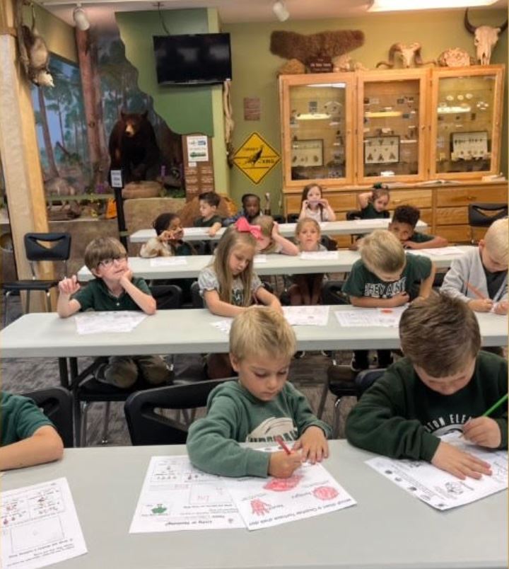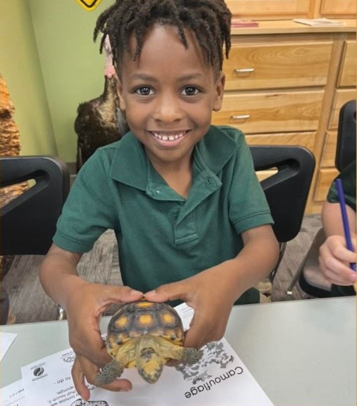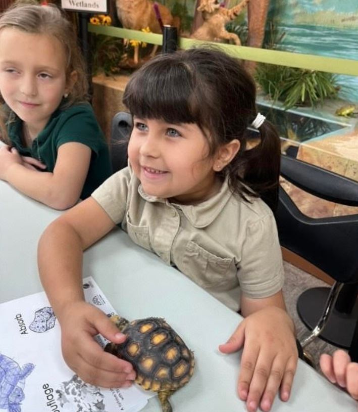 3 classes of kindergarten students from Alabama’s Flomaton Elementary School visited Turtle Point Science Center on Thursday, April 11, 2024. Students celebrated Gopher Tortoise Day with a lesson about gopher tortoises. They enjoyed a coloring sheet about shells from the Alabama Gopher Tortoise Day resources page on the Outdoor Alabama website. A hands-on encounter with a young gopher tortoise brought lots of smiles.